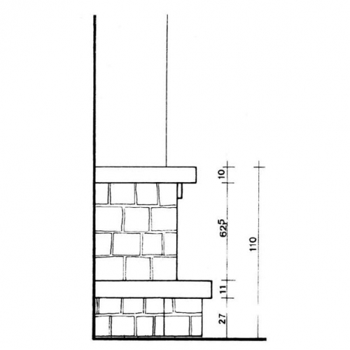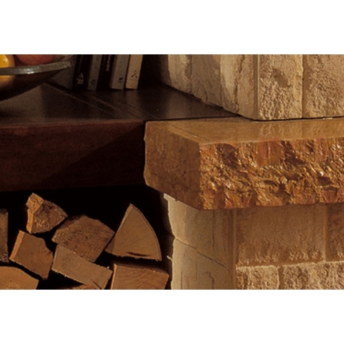 Закрытая по бокам пристенная модель, сокращенная версия. Выполнена из колотого золотистого камня, каминная плита - из желтого королевского мрамора, боковые элементы и балка - из дерева.