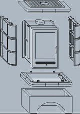 Модель относится к пристенным каминам деревенского дизайна, с характерными элементами этого стиля: Д-образной формой корпуса, каминной балке из массива дерева и высоким дымоходным колпаком.