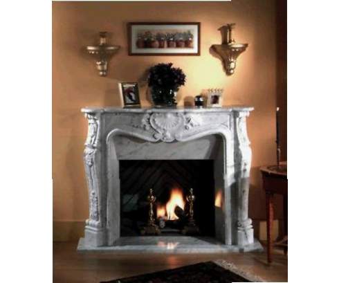 Этот изысканный портал в стиле Барокко украшен резными колоннами и разнообразными орнаментами. Выполненный из классического для этого стиля белого мрамора с серыми вкраплениями, он задает тон всей каминной комнате.
